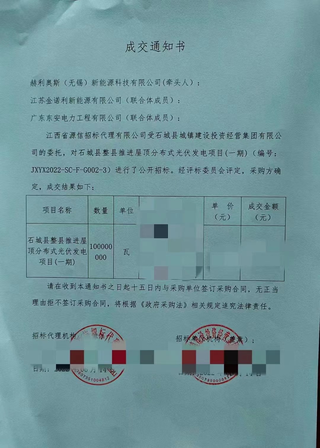 2022年6月14日,江西石城整县推进屋顶分布式光伏发电项目进行公开招标,江苏金诺利新能源有限公司联合中标,此项目一期为100MW。